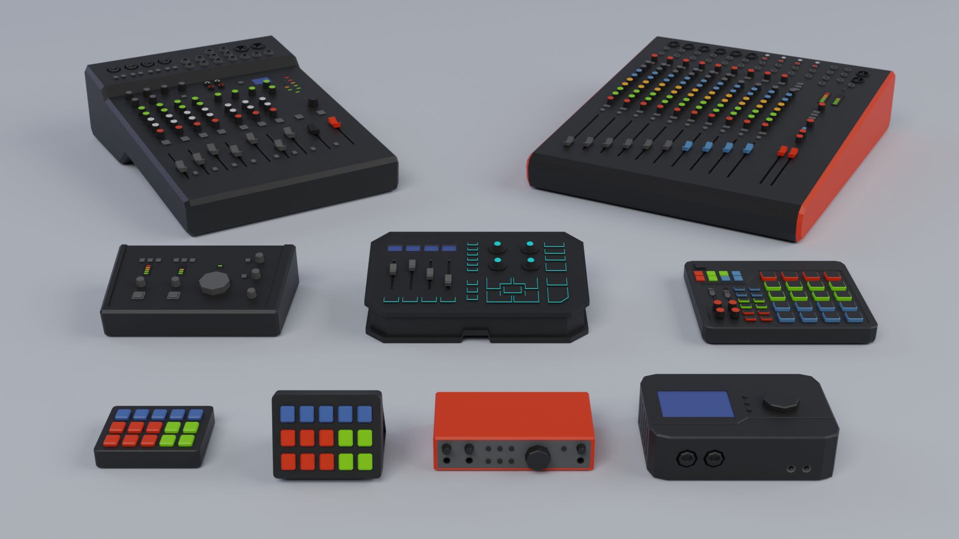 Audio mixers / consoles (small + large)
