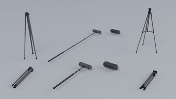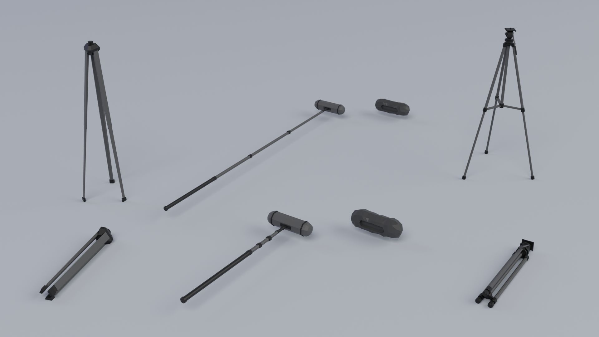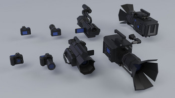 • Models: photo cameras (DSLR-style), camcorders, broadcast/TV cameras, cinema rig cameras, tripods (folded + deployed), boom pole, small accessories.